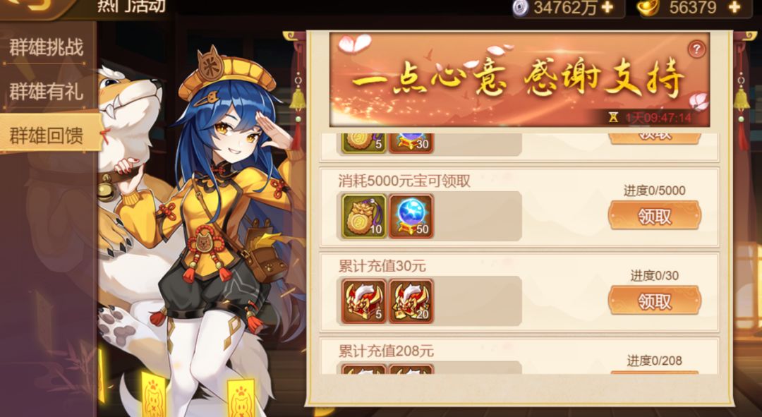 活动简介:本活动为消耗回馈活动,活动期间,达成一定的元宝消耗数量或付费累计额度,即可领取奖励。