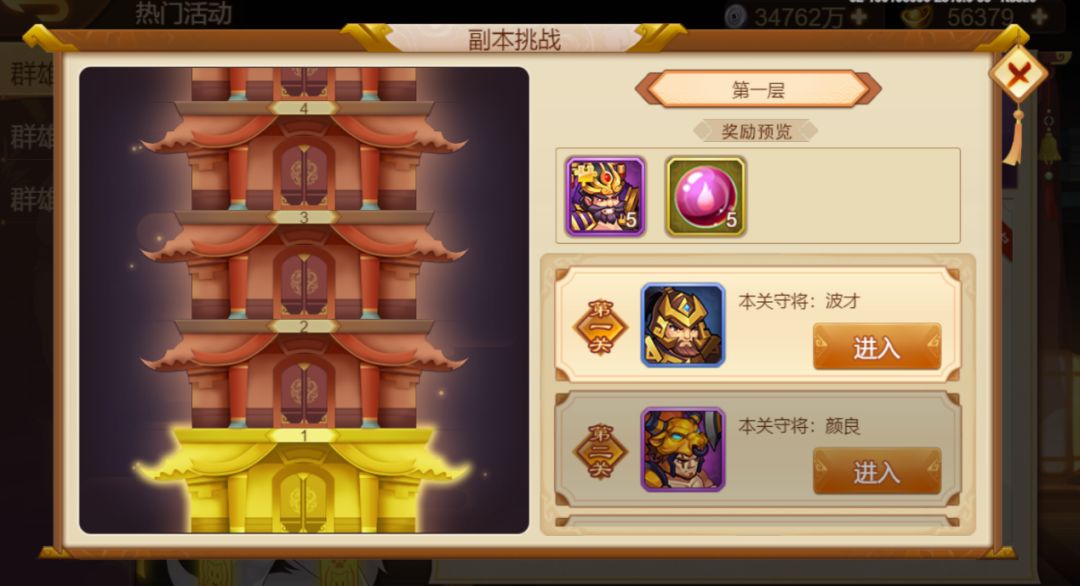 活动简介:本活动为活跃挑战活动,活动副本共有7层,每层4关。活动开启后,每日解锁一层可进行挑战,挑战成功即可获得丰厚奖励。