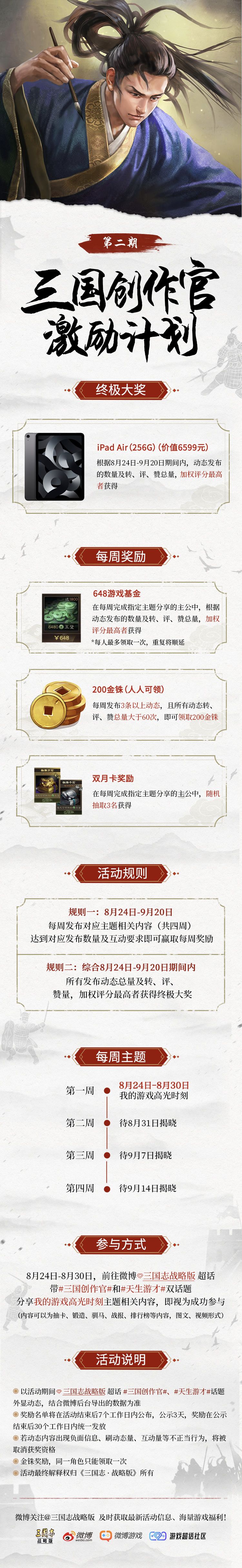 【三国创作官】微博创作激励计划再度来袭,人人可领800金铢,周周都有648,再赢顶配iPad Air!