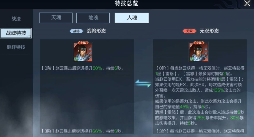 无双状态下,人魂的变化最大,为赵云附加了【雷怒】状态,获得无双值时可以积攒雷怒,使用蓄力攻击与EX技能消耗雷怒,技能伤害与穿透大幅提升,自己还将获得暴击率、暴击伤害提升的强力buff。