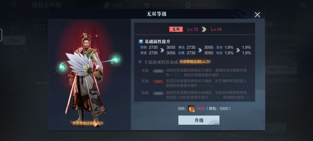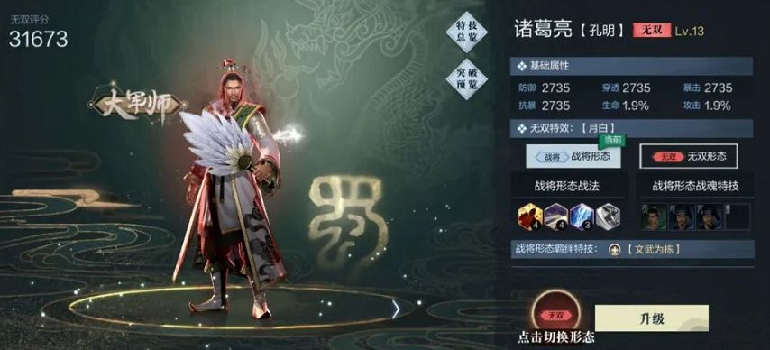 当武将进阶完成后,武将的品质将会由传奇进化为无双,同时战斗中可以进入无双形态,还能拥有全新增幅的无双战法、战魂特技以及无双羁绊特技。
