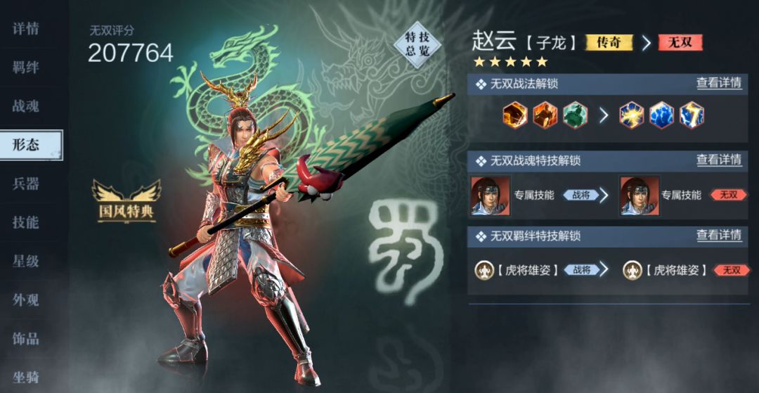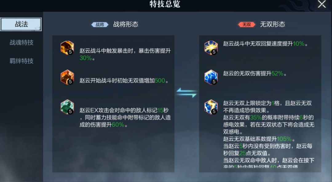 无双觉醒不仅武将自身会进阶升级,他所拥有的羁绊特技也会得到提升,以无双赵云为例。