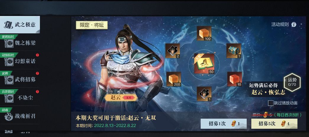 每次招募未获得大奖时,将提升一点运势;当累计运势达到上限后,下次招募必定获得大奖。本期大奖为赵云·恢弘志,可以用于激活赵云的无双形态。