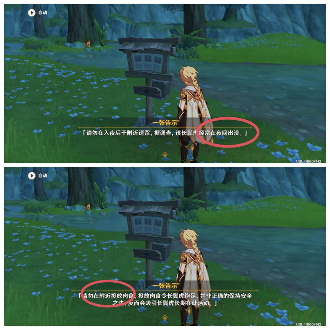 靠近告示牌交互,可以得知,要让长鬓虎罗阇出现,要在游戏时间为夜间时,投喂肉食。
