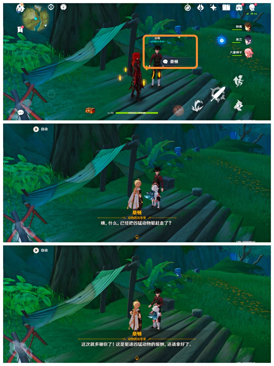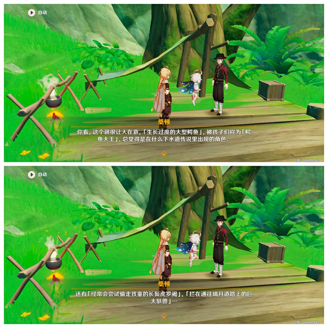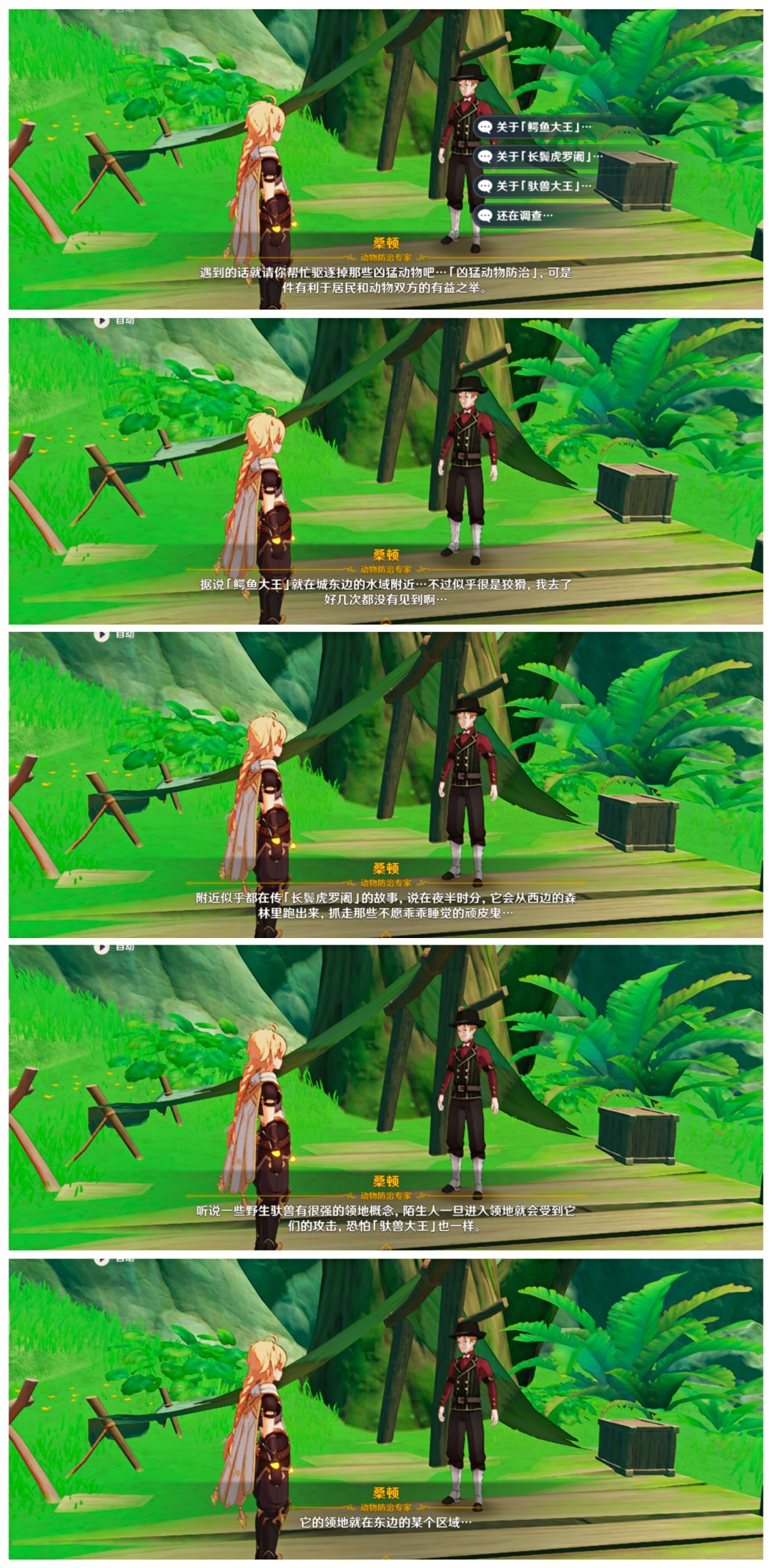 (一)与“???”对话后,可得知他的名字叫作桑顿,是枫丹人,来到须弥的森林贴近自然,顺便接受了一个防治凶猛动物的委托,驱赶些凶猛动物远离居民区;并告知我们有三个目标(以及相关的线索),分别是:鳄鱼大王、长鬓虎罗阇、驼兽大王。
