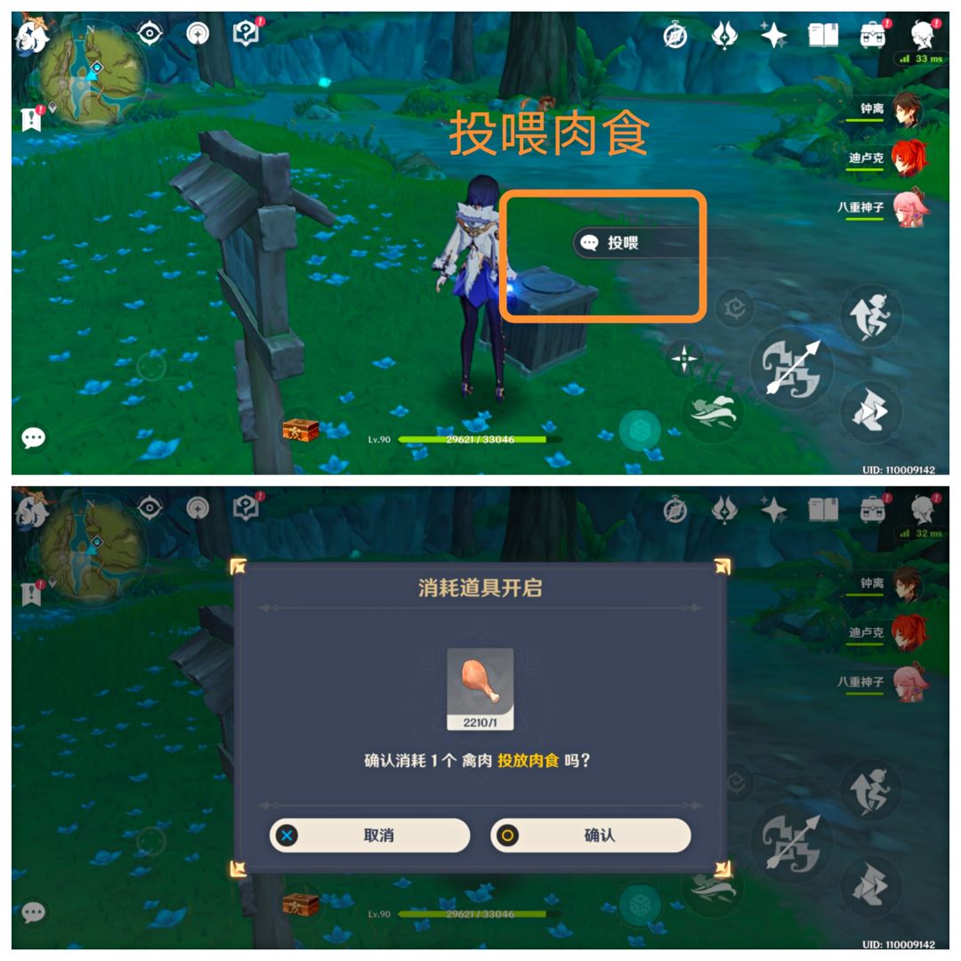 与告示牌后面的碗交互,投喂一个禽肉。