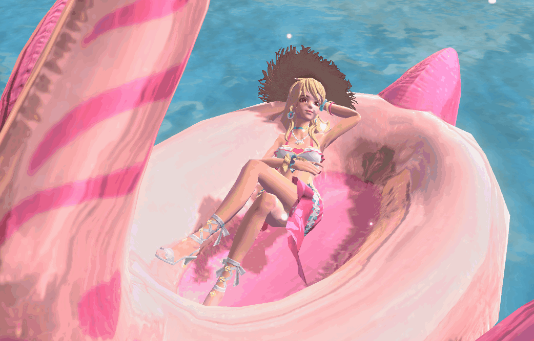 坐骑上展示(坐骑:东海珍贝)海洋的元素不止如此腰间也有珍珠的装饰尤其这个大遮阳帽的设计美观的同时还不妨碍我们美女们防嗮设计师大大用心了哦~~