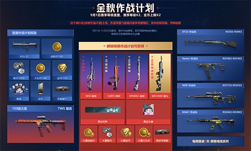 首个通行证「金秋作战计划」同步上线,作战等级绑定赛季等级,赛季期间提升作战等级得货币道具、喷漆名片、武器军备箱等奖励,每周可免费获取非凡武器。此外解锁精英作战计划,还能领多款枪械皮肤、限定军牌头像、海量货币道具和军备箱福利!