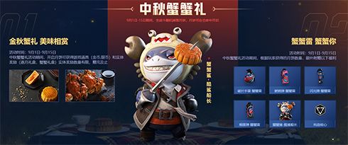 9月1日-9月15日中秋蟹礼活动来袭!活动期间进行任意模式的战斗会随机掉落月饼,开启月饼可获得金币银币游戏道具与逐月礼盒/蟹蟹礼盒实物奖励,实物奖励数量有限赠完即止。其中蟹蟹礼盒为官方品牌合作伙伴蟹太太的大闸蟹代金券,膏黄满溢美味共赏,沉沦在这一口金秋的鲜美馨香滋味。同时依据掉落的月饼数量还将额外附赠「蟹蟹雷」系列投掷物、酷鲨船长大头形象与构造核心道具。