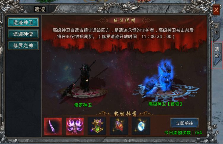 右边选择遗迹地图选项,即可点击立即前往进入修罗遗迹跨服地图。