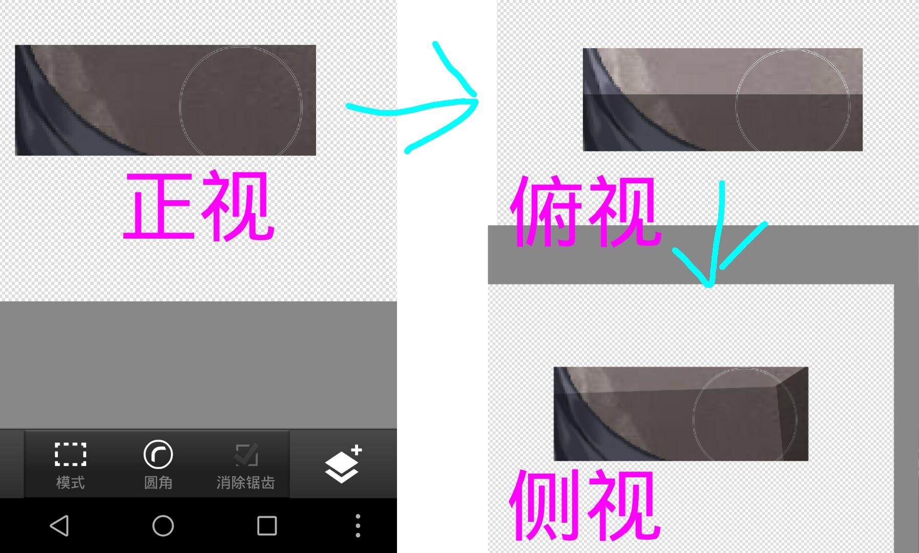 比如下图正视,它作为一张平面,我把上半部分亮度调节变得更亮,看起来多出了两个角。又将一边调暗,又多出了两个角,成为了侧视。