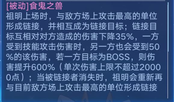 ①祖明会与对面攻击力最高的形成链接,一个受到伤害,另一个也会受到伤害,有点类似三国杀中的铁索连环(注意攻击力最高,这里的攻击力是指基础攻击力)