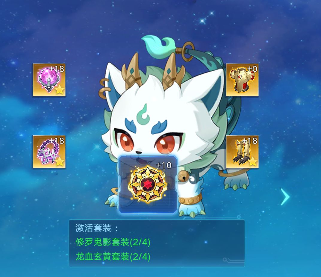 ②要么你带两套两件效果+180体力的,比如带两件修罗+两件龙血,如下图(两件套效果+180体力的有,修罗鬼影/机甲蔷薇/无限量子/龙血玄黄/神木真灵/旗云动天,这几个挑两套,每套都选两件出来)