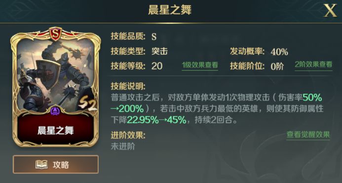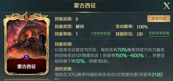每回合70%概率对敌方最低兵力目标进行高额的输出,且具有一定的破甲效果,同样该破甲效果为比例破甲,比较好用。