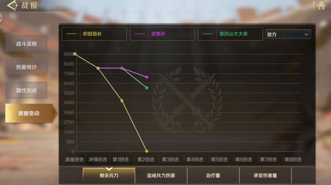 由数据变动图分析,敌方织田信长的剩余兵力下降速度极快,这也可以从侧面看出集火突击队的输出之高效。