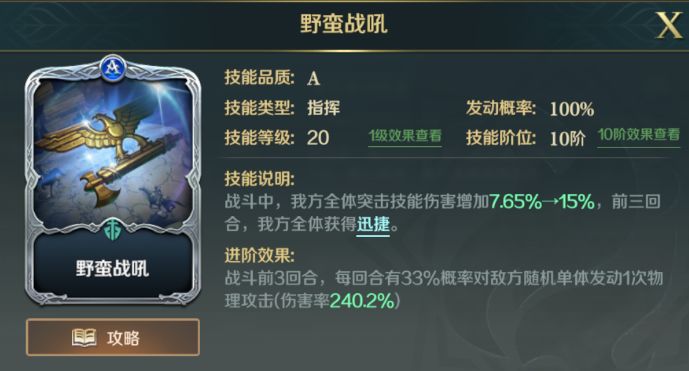 【野蛮战吼】提供突击技能增伤效果以及全体迅捷,这也使得我方在前几回合可以优先出手,占到绝对优势。
