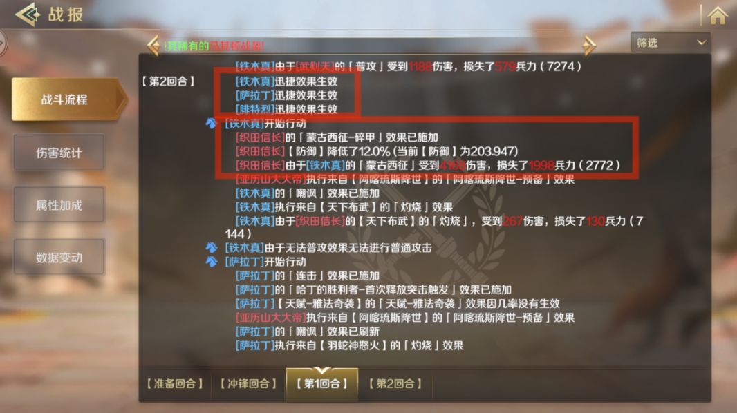 织田信长由于铁木真的破甲效果降低了防御,同时铁木真也提供了近2000的高额单点输出,为之后战魂萨拉丁和战魂腓特烈的发挥做好了铺垫。