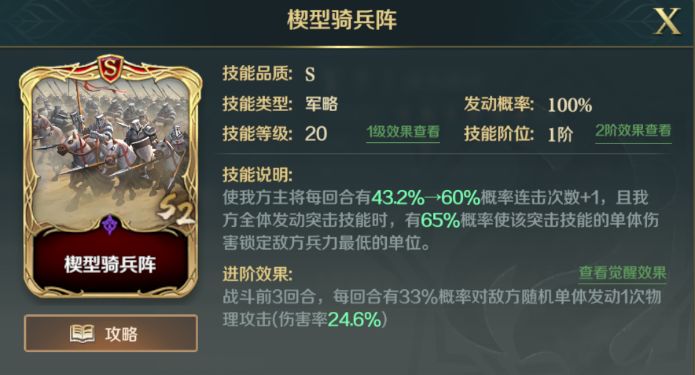 单点集火技能,具有高额的二段伤害,搭配【楔型骑兵阵】的集火效果可以非常稳定的实现高额的定向输出。