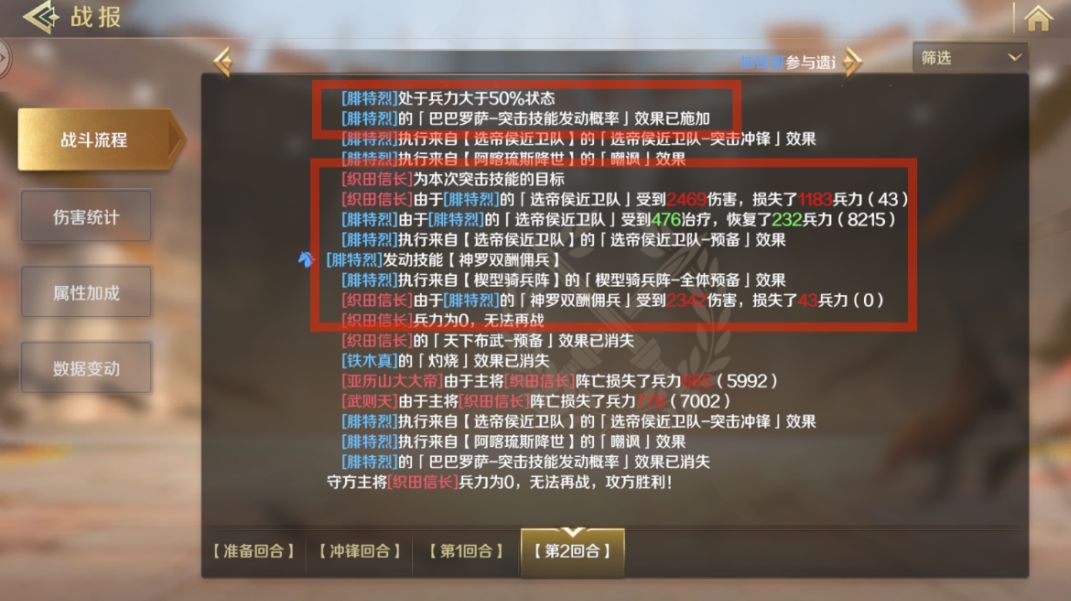 当战魂腓特烈每次发动突击技能时,【选帝侯近卫队】可以非常稳定的执行跟伤效果,对织田信长进行高额输出,最后织田信长由于一系列的破甲效果和单点输出,仅2回合就暴毙,我方轻松取胜。