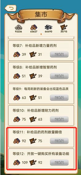 -----更新完的小伙伴们一定要去集市升级喔,因为集市开到了12级,才能开放一键购买的功能还有补给品药剂数量翻倍(集市要升级药剂才能带2瓶,不然药剂只能带1瓶)。