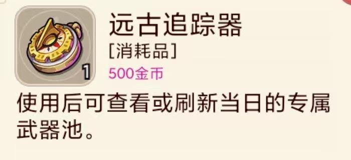 -----专属池如果有我们不需要的专属,我们就可以手动去刷新,而刷新需要一个新的物品,那就是:远古追踪器(远古追踪器在集市里购买,需要消耗25点能量)。注意了:该物品要遗迹20层才能解锁购买!!要查看当天的专属池,也得通过远古追踪器查看。