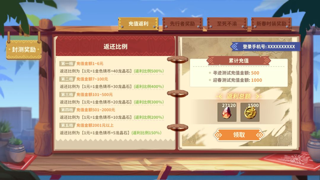 关于各位冒险者在测试期间累计充值的金额将按照【充值返还规则】,在游戏上线时进入游戏领取返还。