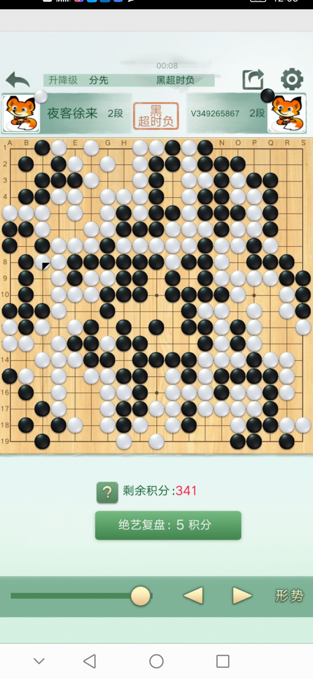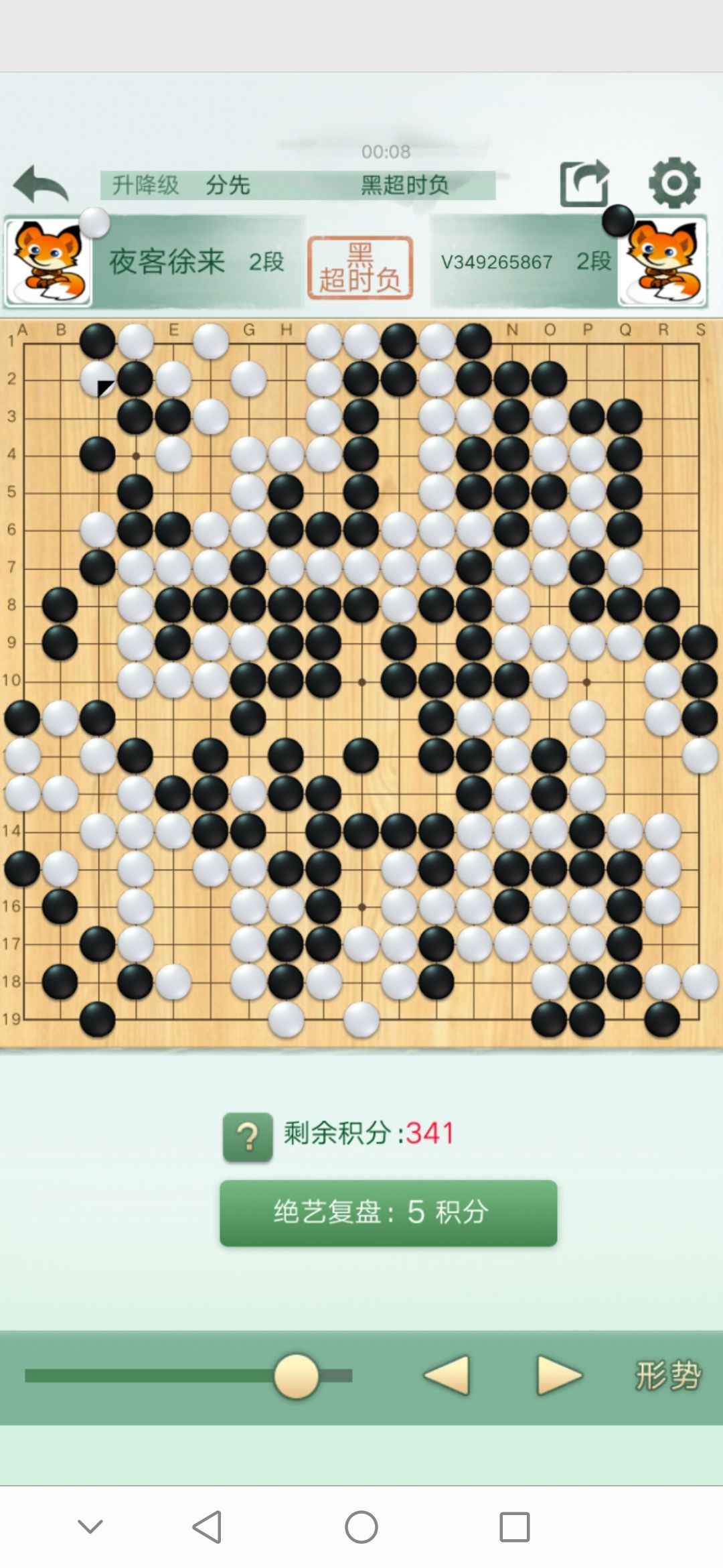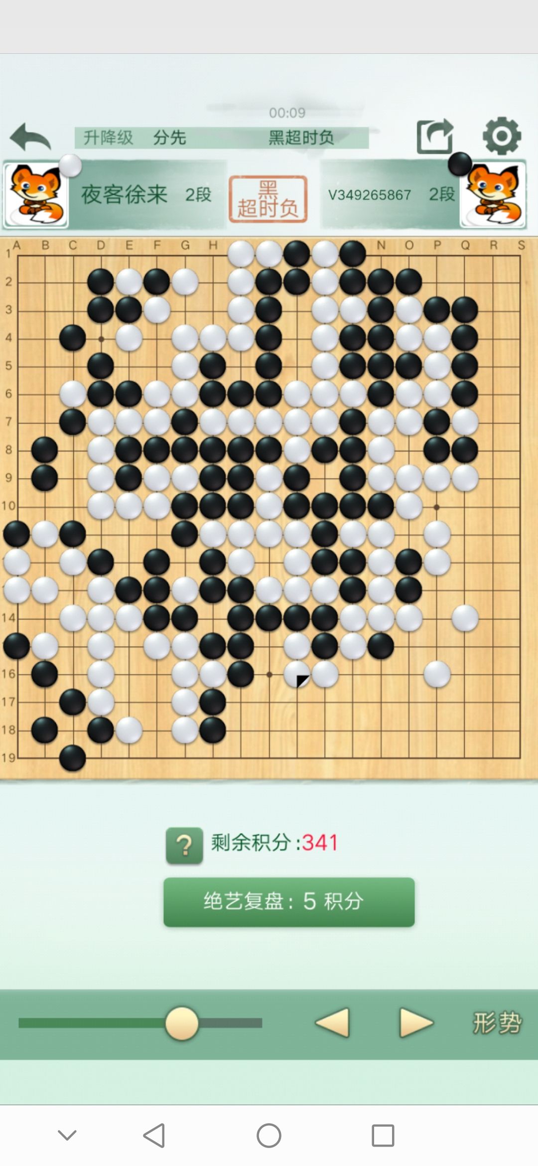 不过上天给了我一个棋力较弱的对手,胜利已经被我拱手送出去了他把握不住,后面两个劫打的很爽。赢在运气。