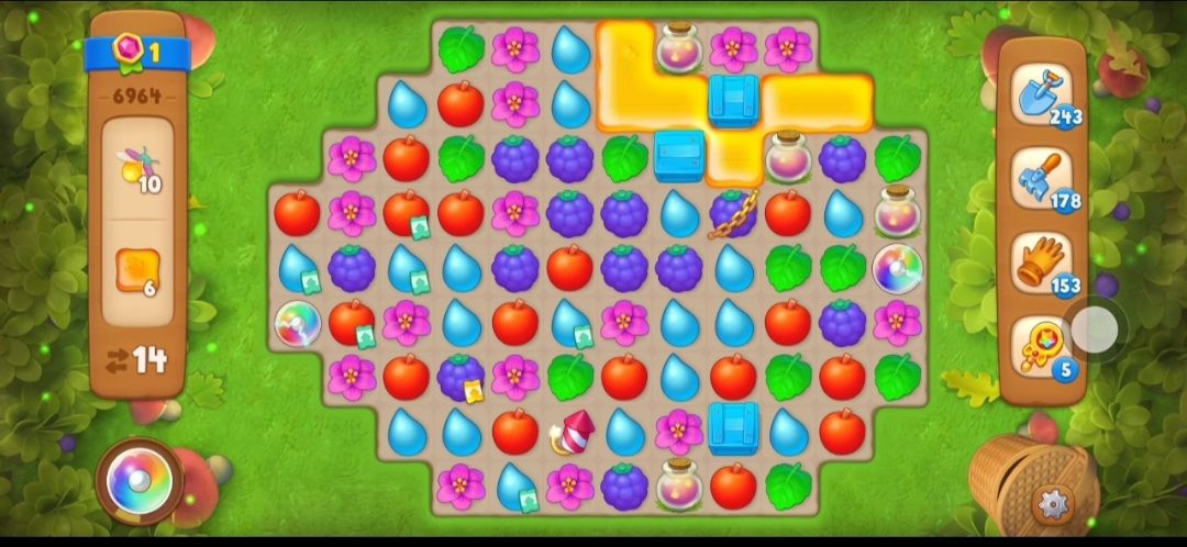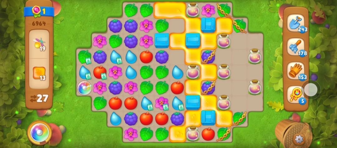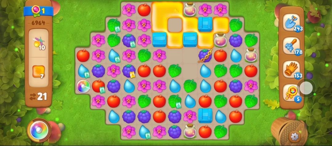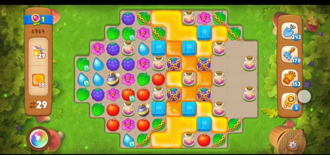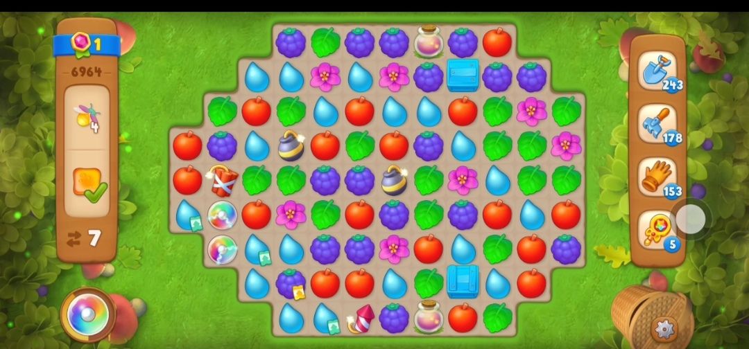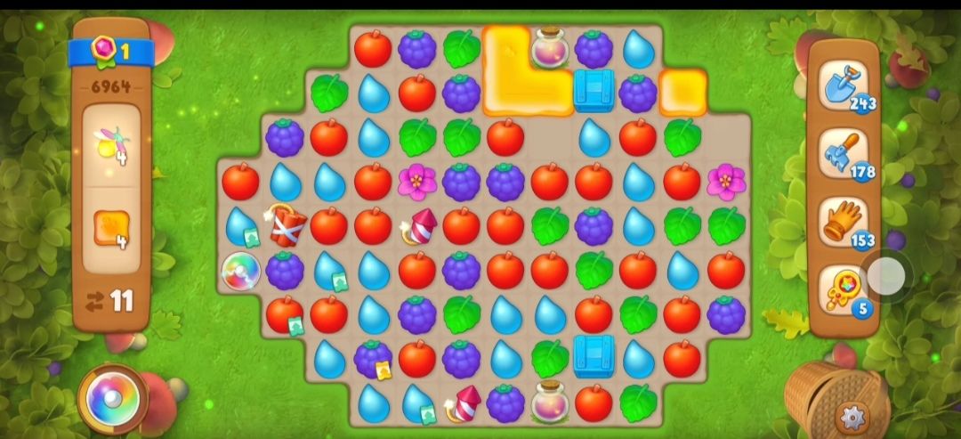 ⑤接下来在蜂蜜旁边元素匹配交换消除剩下的右边的蜂蜜,露出萤火虫罐,然后开始收集萤火虫,萤火虫需要在萤火虫罐旁边进行元素匹配,如果萤火虫罐里没有了萤火虫,那么这个萤火虫罐就会消失。