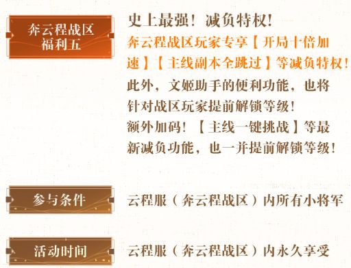 注意事项:升级可获元宝及绸缎奖励兑换精美皮肤专属七日签到,可免费获取额外获取一名魂将首月三心愿(每个心愿30%,心愿更加容易获取)副本特权,开局开启十倍加速,所有副本均可跳过(过副本更加简单,节省大量时间,也让很多低概率的阵容更容易通过副本。)