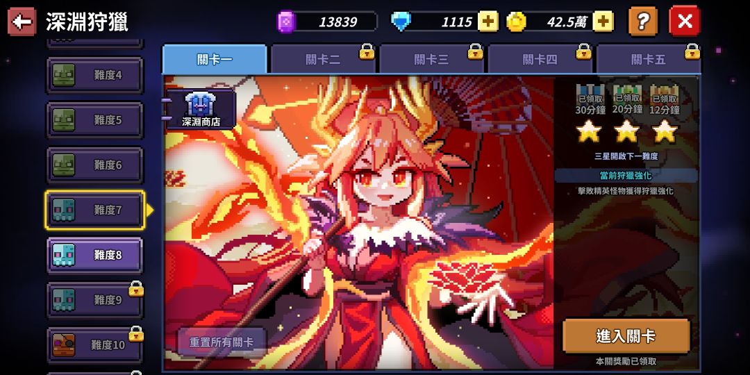 深淵狩獵目前只能到難7,難8實在傷害不夠(「・ω・)「嘿