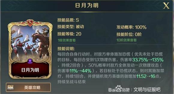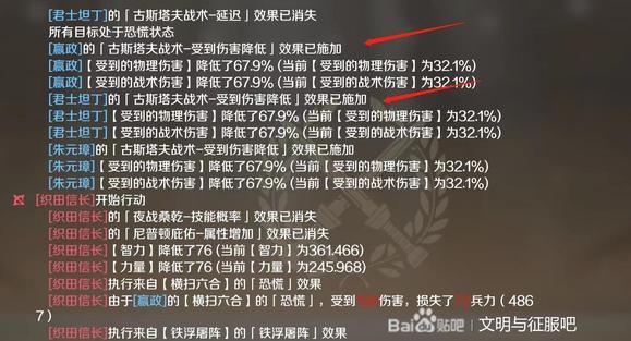 在朱元璋和嬴政百分百恐慌覆盖面下,此技能的伤害非常可观,最高属性的降低,不仅仅限制了敌方的战术和物理输出,并且降低了敌方治疗量和防御值,可谓是“一箭三雕”!