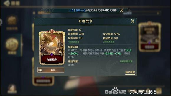 被动技能,不受任何敌方技能影响,优先对未处于恐慌的目标施加恐慌状态,同时使敌方禁疗,并随机使我方英雄防御增加16点,持续至战斗结束!