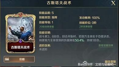 提高自身属性,在第3和6回合使我方主将获得高达18%的增伤效果,与【古斯塔夫战术】完美衔接,提升队伍生存力和输出能力。
