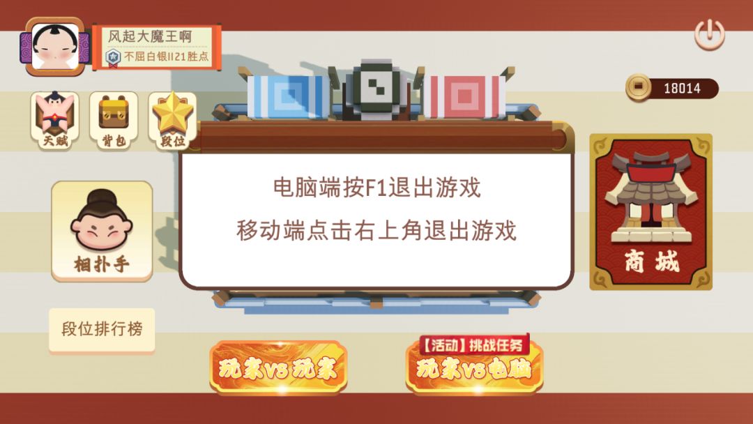 除此之外,在大厅还可查看自己的段位排名,并领取对应段位的奖励。甚至在游戏开始前,消耗铜钱还可随机升级一项天赋。当所有准备就绪后,点击【玩家VS玩家】或者【玩家VS电脑】就可以开始游戏啦。