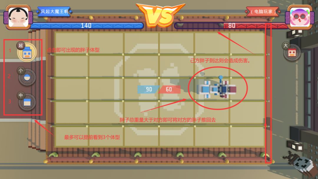 游戏非常简单有趣,玩家化身操盘手。在棋盘上共有5条赛道,当左侧带有“超”“小”“大”等描述的头像亮起时,点击任意赛道即可将对应的胖子(即相扑手)召唤出来。胖子登场后将一往无前,直至越过对方底线或者被对方的胖子推回来。博弈时一般会出现以下三种情况。