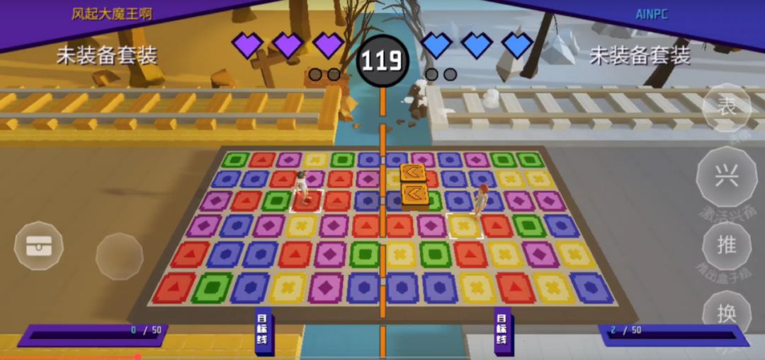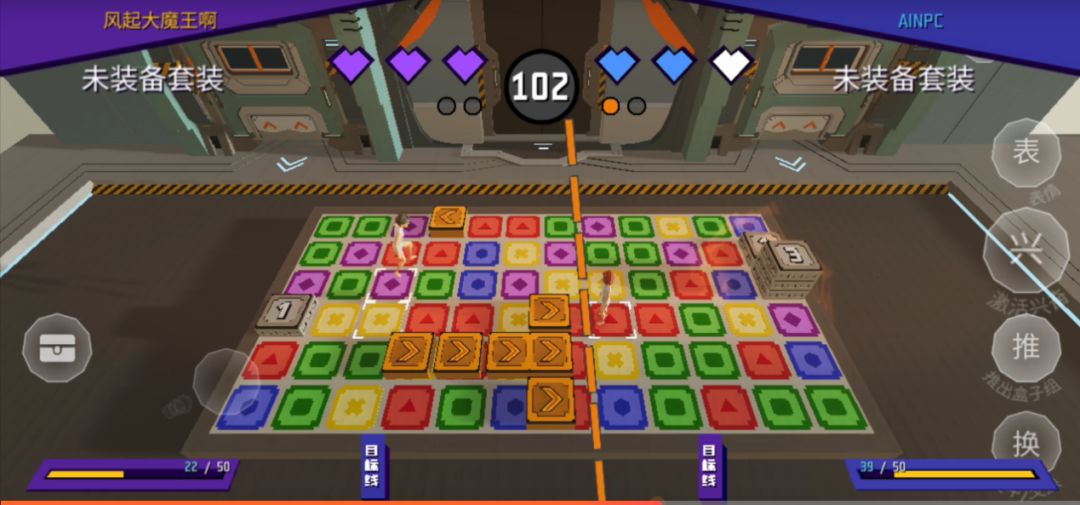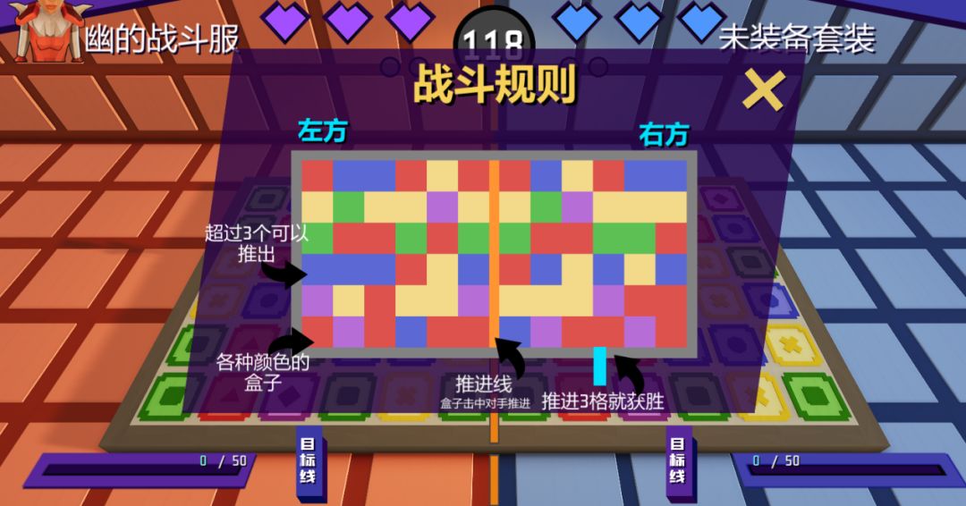 游戏中只要集齐三个以上相同颜色的盒子,就可以按下【推】键向前推出盒子,并攻击到对手那一侧,成为对手地盘上的障碍物。双方玩家共有3颗心的生命值,每次被盒子击中就会减少一颗,因此,快速寻找相同的盒子并将它们击打向敌方才能获得胜利。