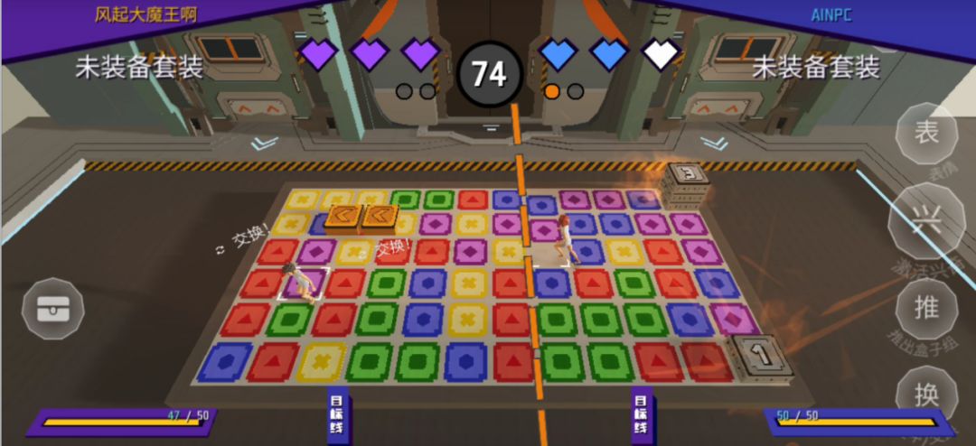 游戏操作非常简单,通过轮盘键控制角色的上下左右移动,按【换】键选中/交换当前盒子,按【推】键推出当前盒子,【兴】键可以激活兴奋,【表】键可以使用表情。