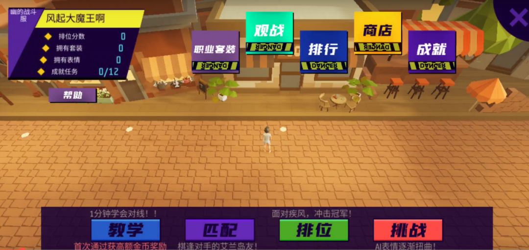 界面左上角是你的个人信息,可以查询你的游戏资料和排位分数;依次向下看是【帮助】按钮,这里可以查看游戏规则、玩法相关的全部内容,有任何游戏玩法问题,都可以来这里查询。而屏幕中央的五个按钮都是对应的功能键,其中【职业套装】和【商城】可以购买和更换角色服饰以及相关技能。
