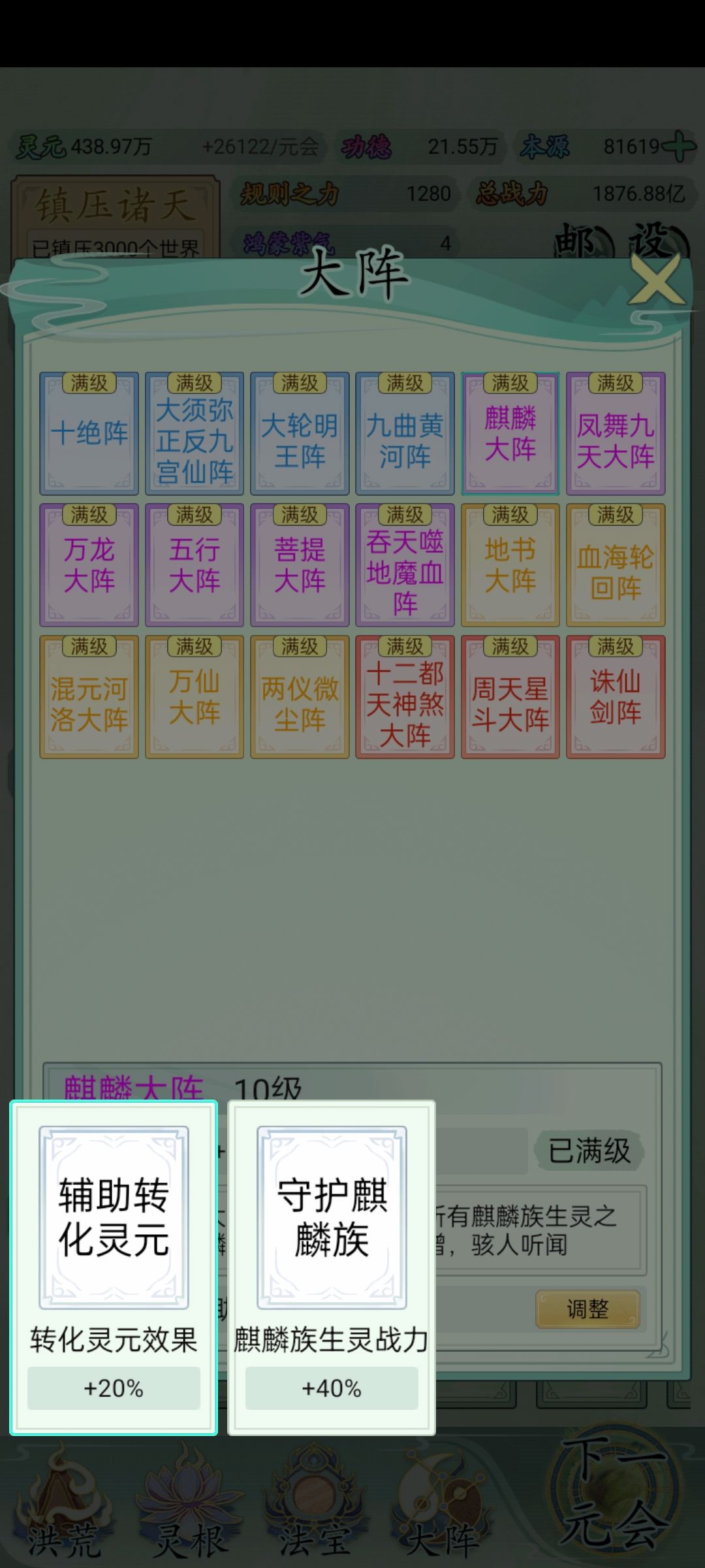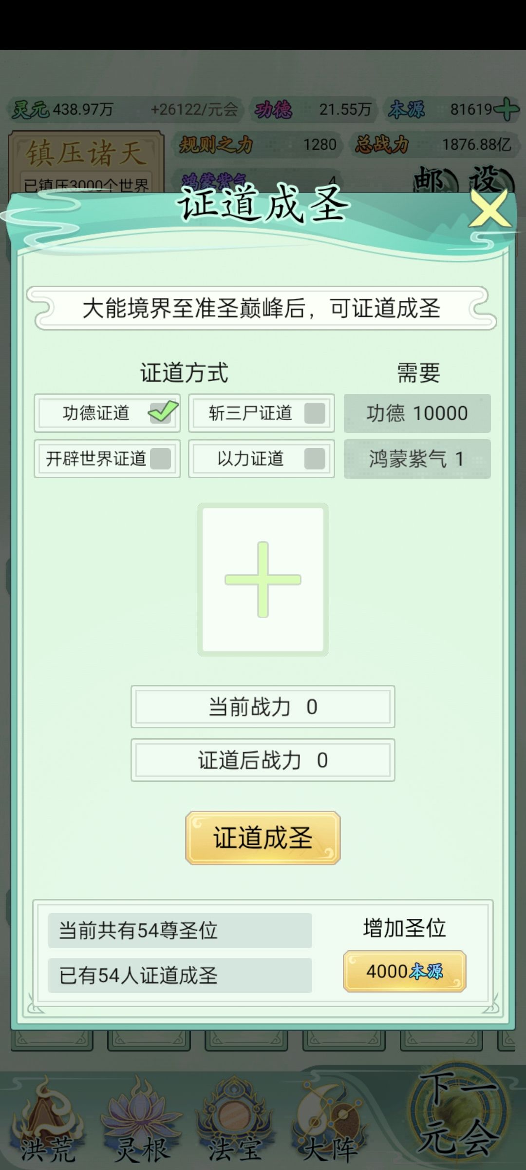 也玩了一小段时间了比不上大佬但还是说一下吧希望大家可以看见前期没灵元可以先把大阵解锁全部调整加灵元灵根尽量升满然后就是各族使命可以用推荐先全部堆灵元足够了看需求再换还有量劫一定要提前化解不然还是会发生还有就是神通和金榜个人觉得这是最主要最容易提升战力的两个方法你看你要养谁就可以给谁先学神通可以无限刷新给谁学不过需要足够的本元还有打入侵一定要百分百再打我百分之九十八被打掉境界过难受的一匹后期然后就是圣位前期能升成圣的一定要升不然战力加太慢了女娲伏羲在龙汗浩劫到准圣就可以在下一浩劫转阵容会转两次到人族之后就可以正常正道成圣了天帝和瑶池也要转阵容才能成圣后土也需要转到地狱但具体我不晓得怎么成圣我是把她地府两个橙色的升到圣人巅峰她突然就成圣了的哦对了还有天命之子可以多一倍的修行速度这个也是看你要养谁