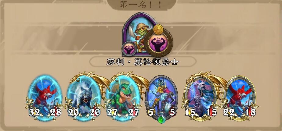 奖品对局,一本先搜到两个对子,对五出鳄鱼瑞文先锁血,中间出了个斯德尼技能脑血栓了给瑞文点了一个,只能含泪先卖了。不过同时来了复生蛇贴给鹦鹉宝藏给升本减五上本找到白狼,战力还行稳得住。然后下回合瑞文就回来了,暴龙三连对出另一个白狼,之后就是平平无奇搜拿全金豪华。最后厄祖应该是宝藏点了个金猎马,吓我一跳,不过刷的是伊利丹的技能,还有个螳螂妖挡着,随便猎