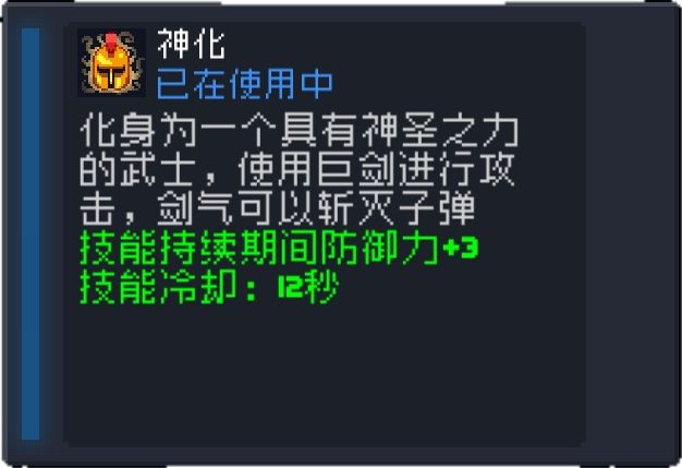 技能CD为12秒,使用后变成一个神圣武士,持续7秒(导师加强后为13秒,并且攻速翻倍),技能持续期间能发射剑气,剑气能斩灭子弹(拥有近战反弹后剑气能反弹子弹),剑气初始1秒发射1次,伤害为10点(可以暴击,并且被剑柄打到的敌人会再额外受到10点伤害),角色强化到5星后技能持续期间防御+2
