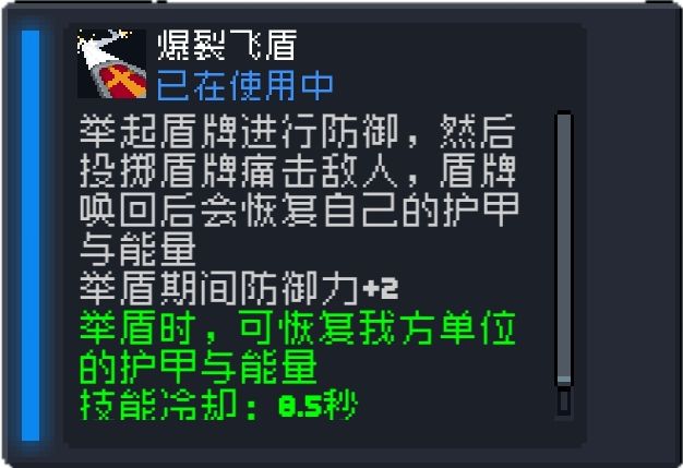 技能CD为8.5秒,使用技能后进行举盾状态,举盾状态下防御+2,举盾状态下点击攻击键将把盾牌掷出,盾牌将在敌人间或地形间弹射,造成6点伤害并使敌人眩晕(此技能伤害百分百暴击),再次使用技能将把盾牌收回(或等一段时间盾牌自动收回),收回后,技能将根据盾牌离手时间减少CD(最高能完全重置技能),并回复2点盾值和10点蓝量,角色强化到5星后使举盾瞬间也能为所有人回复2点盾值和10点蓝量(导师加强效果为让所有人获得一个持续5秒的屏障,效果等同于红武盾牌)