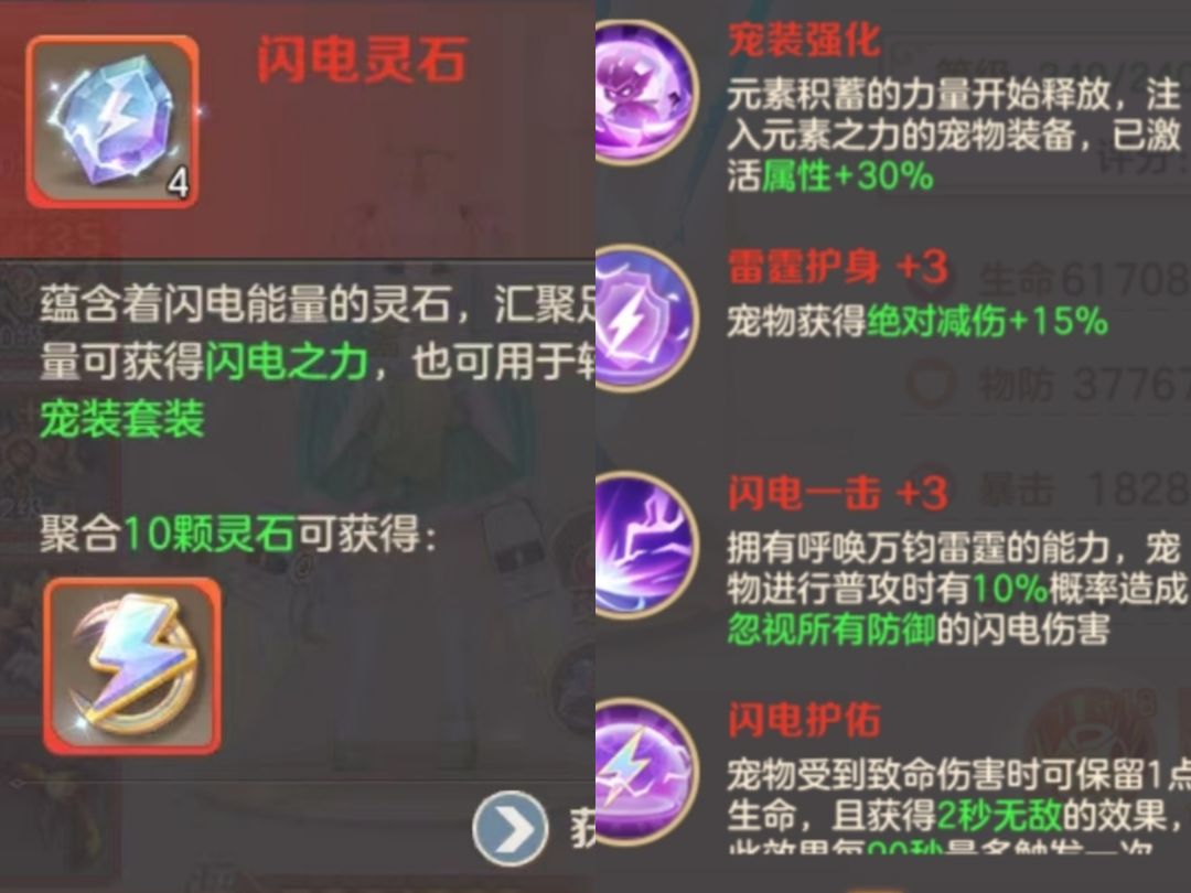 十个闪电灵石可以合成一个闪电之力注入到红色六星的宠物装备上,当一二三号位装备都注入闪电之力后,会激活闪电之力的四大套装属性: