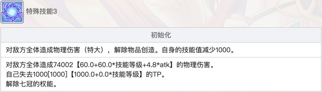 效果为:特大幅度提升自身的物理攻击力和物理暴击率。解锁七冠的权能,小幅提升我方物理暴伤,使用“初始化”时,解除权能并对敌方全体造成物理伤害(特大),自身的技能值减少1000