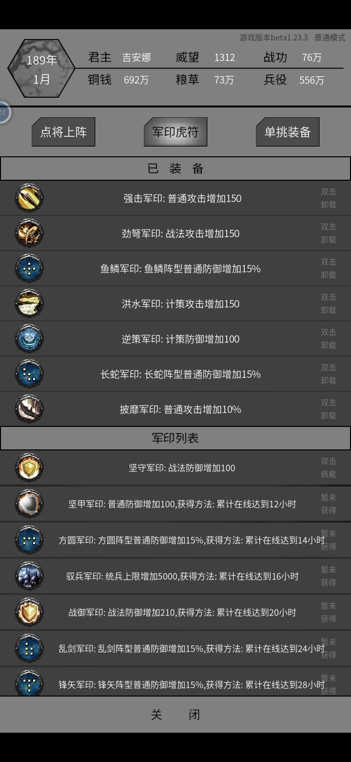 3.进入布阵的军印虎符(累计在线时长获得),装备普攻+150和普攻+10%的军印,前期轻松过关啦。