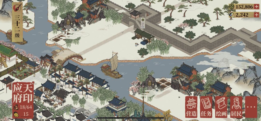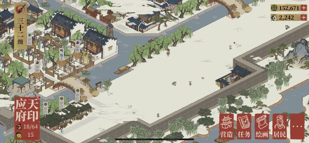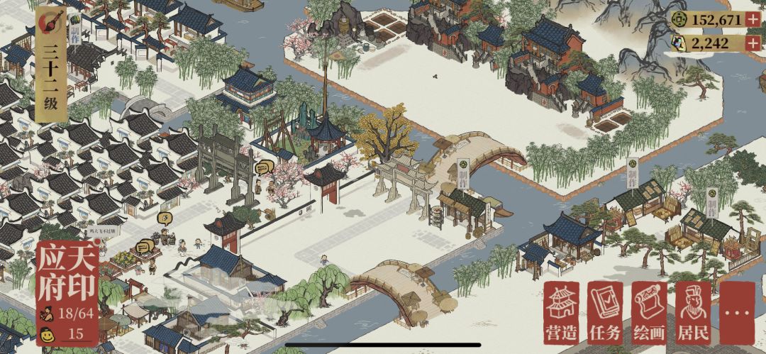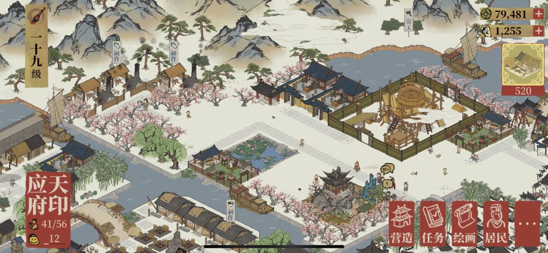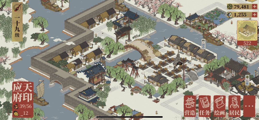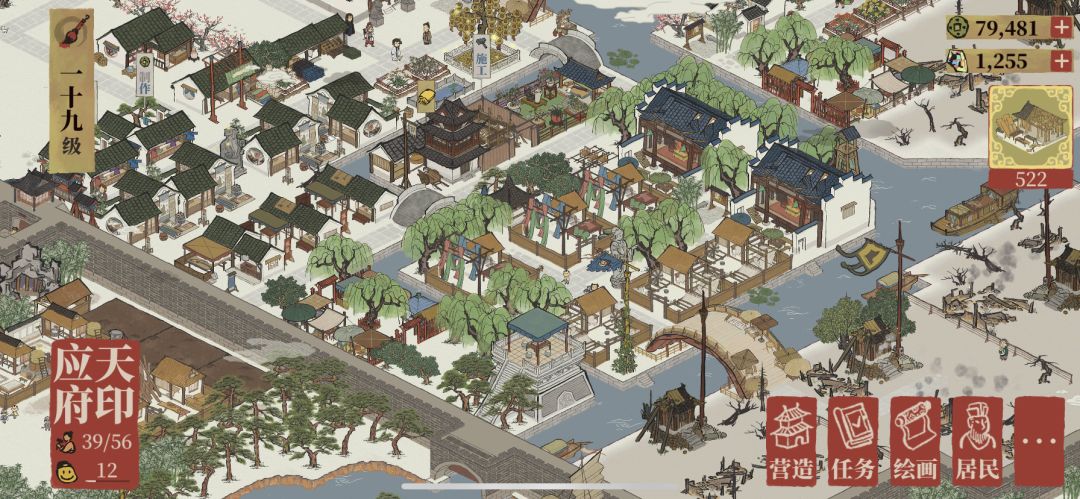 先从应天府开始。典型市中心,应天府课税司和客栈,桥下是以摇钱树为主的景观带。应天府前面空的位置准备后面再放住宅(如果还能再繁荣的话),打造环内高档小区。不升繁荣的话就放点商业小店。