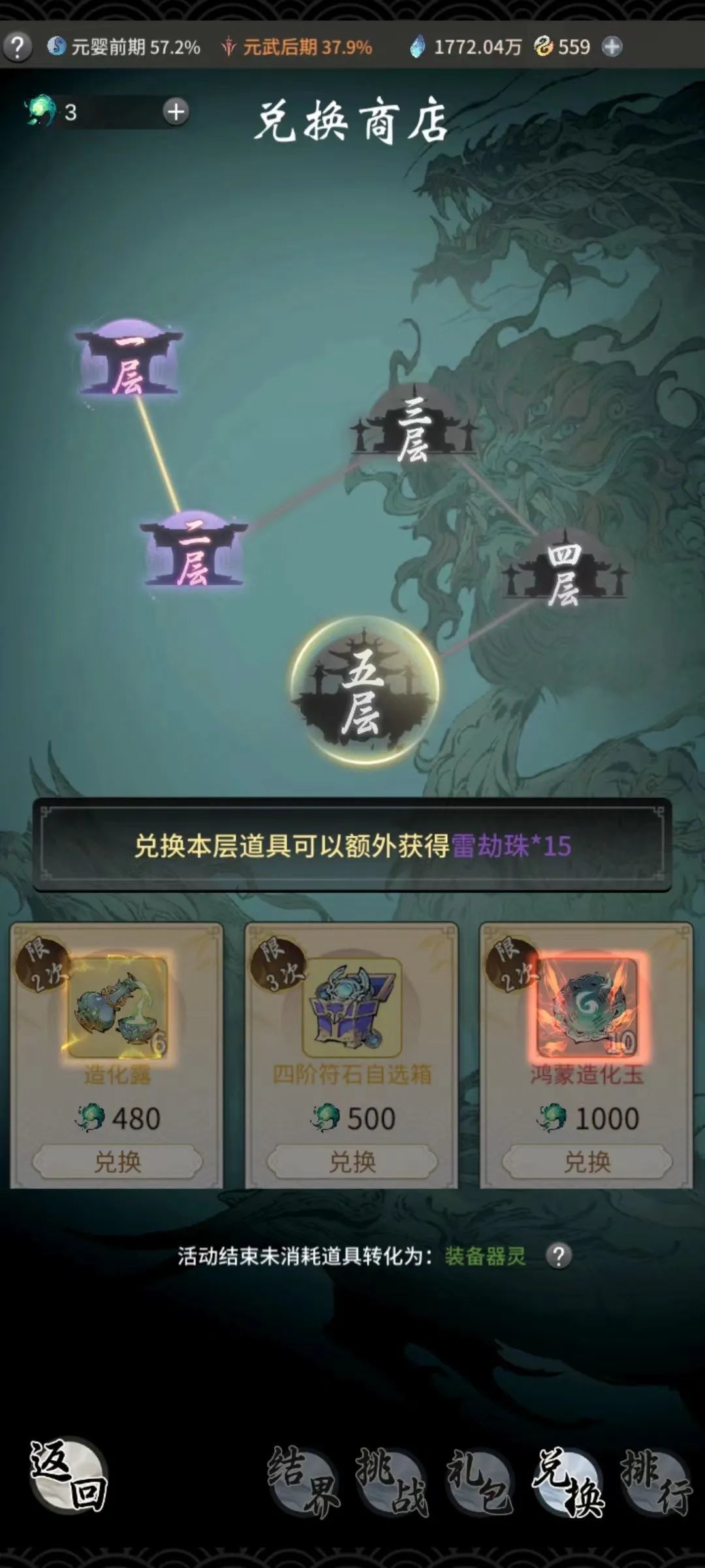 兑换造化玉是在兽潮入侵活动兑换商店的第五层,从第一层到开启第五层,需要经过每一层至少一次的兑换;下面是每一层的兑换商品,以及次数和值得兑换的奖励(注意标识)