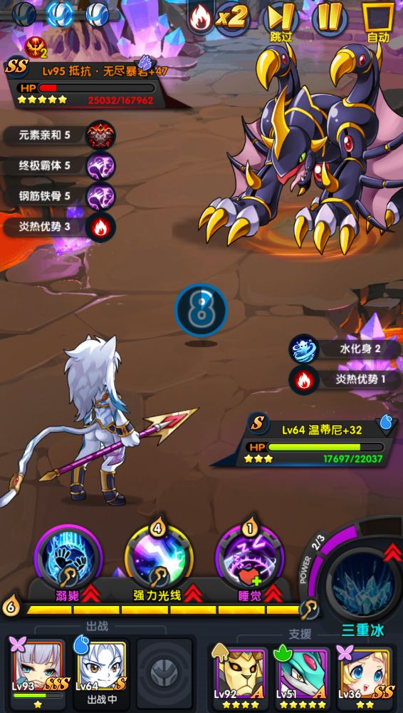 无敌-夜魔(无敌被动):死神镰刀,每8回合触发一次注:她上场后是8的倍数都会触发该被动,该被动只有攻击命中敌人才会生效(夜魔的持续伤害技能无效)