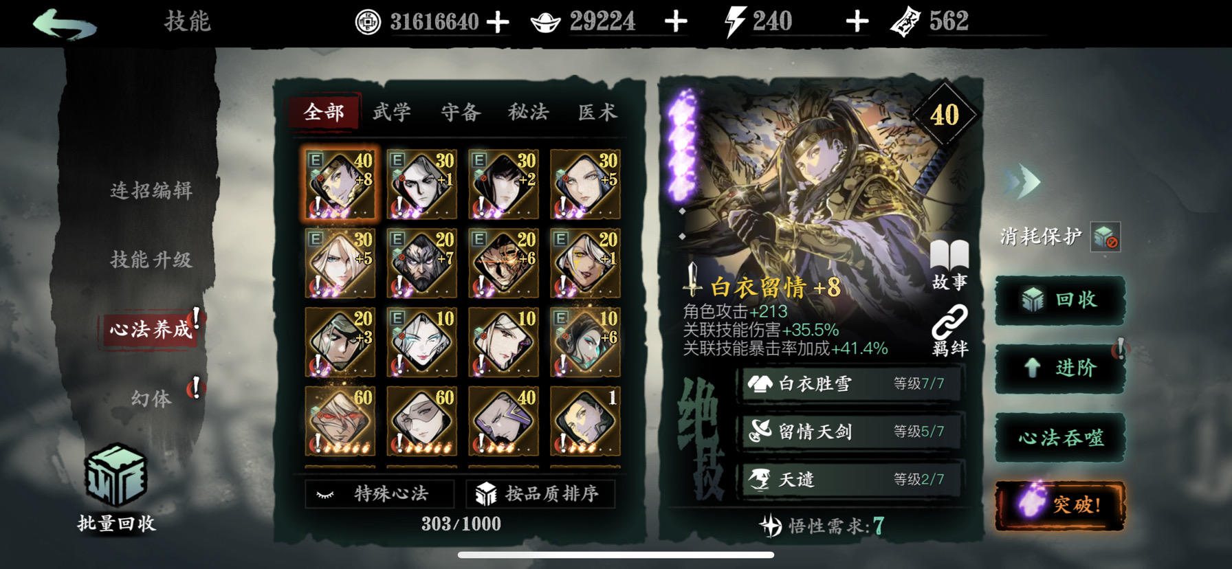 影之刃3公测就开始玩了,做完五圣弃坑的。目前身上60绿套都有(没做宗师),心法如图。问下大佬现在回坑要做什么,小厮解锁了,虚空的话打不过无尽36,目前才31。别让我跑(知道论坛风气不好,哈哈哈哈。至少一圈游戏玩下来还是觉得远征和影之刃好玩)