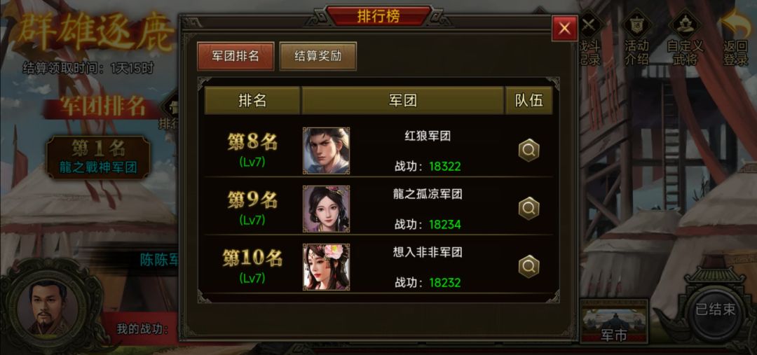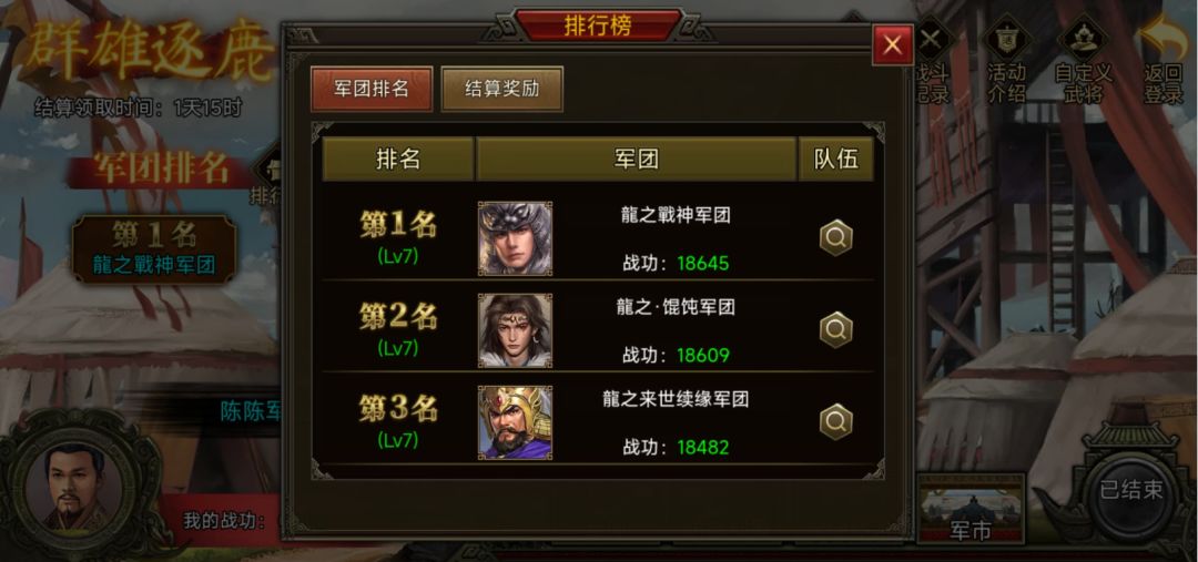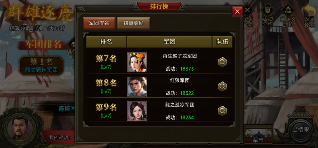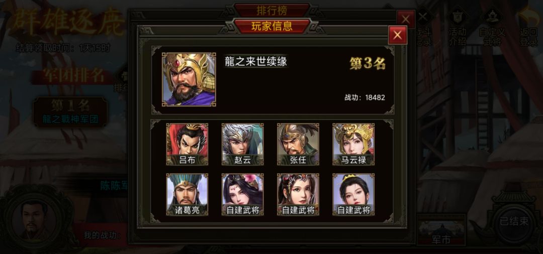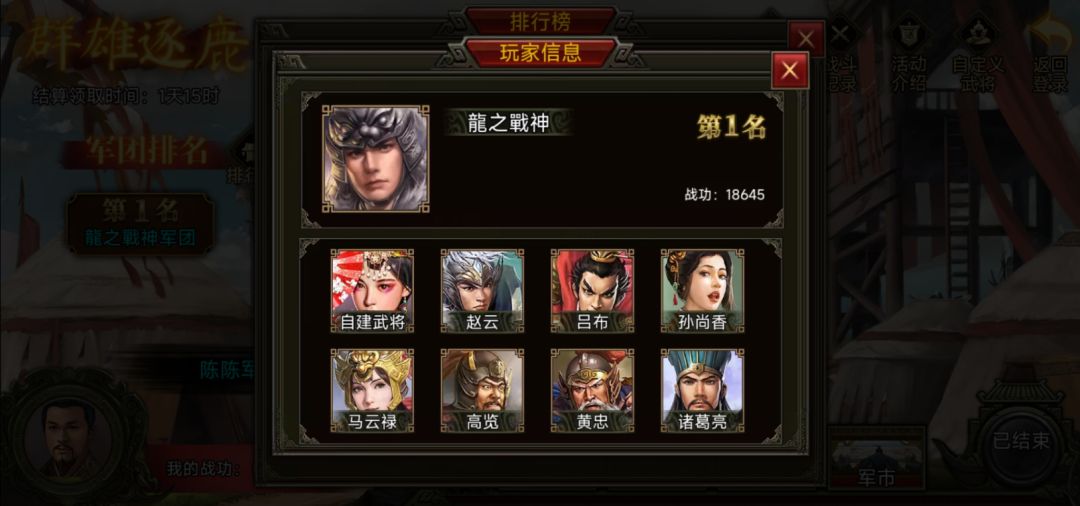 第一名的军团仍旧是我们的老熟人龍之戰神军团!龍之戰神军团配备的武将是赵云、吕布、孙尚香、马云禄、高览、黄忠、诸葛亮、曹仁+2个自建。